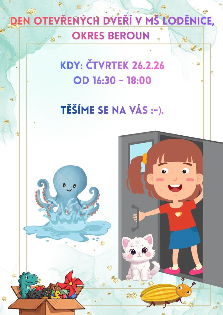 srdečně Vás zveme na Den otevřených dveří v Mateřské škole Loděnice, okres Beroun. Přijďte se podívat do naší školky, prohlédnout si prostory a seznámit se s naším týmem i pestrým programem, který nabízíme dětem předškolního věku.