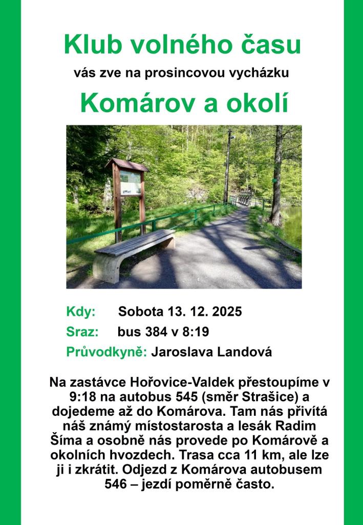 Klub volného času vás zve v sobotu 13. prosince 2025 na prosincovou vycházku: Komárov a okolí. Sraz na autobusové zastávce (odjezd autobusem 384 v 8:19).