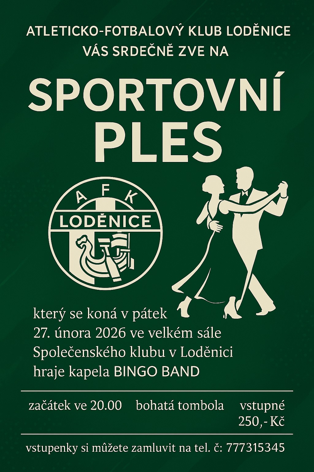 Atleticko-Fotbalový Klub Loděnice vás srdečně zve v pátek 27. února 2026 od 20:00 do Kulturního zařízení (velký sál) na SPORTOVNÍ PLES.