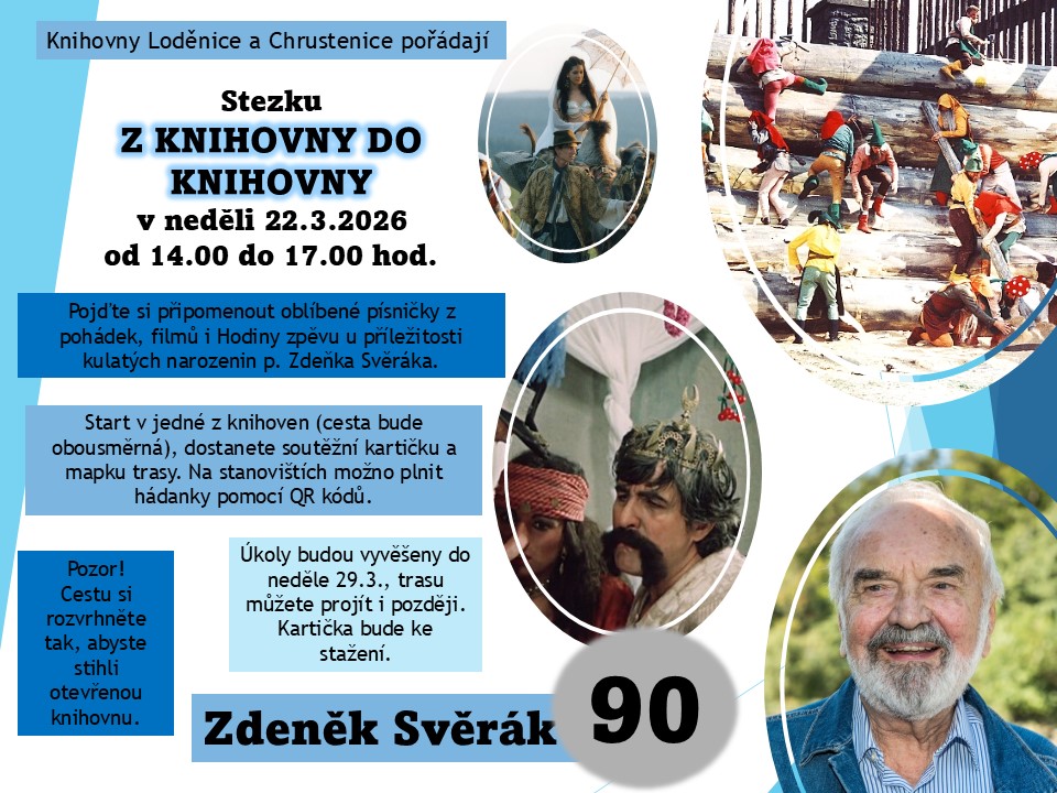 Knihovny Loděnice a Chrustenice pořádají STEZKU Z KNIHOVNY DO KNIHOVNY v neděli 22. března 2026 od 14:00 do 17:00.