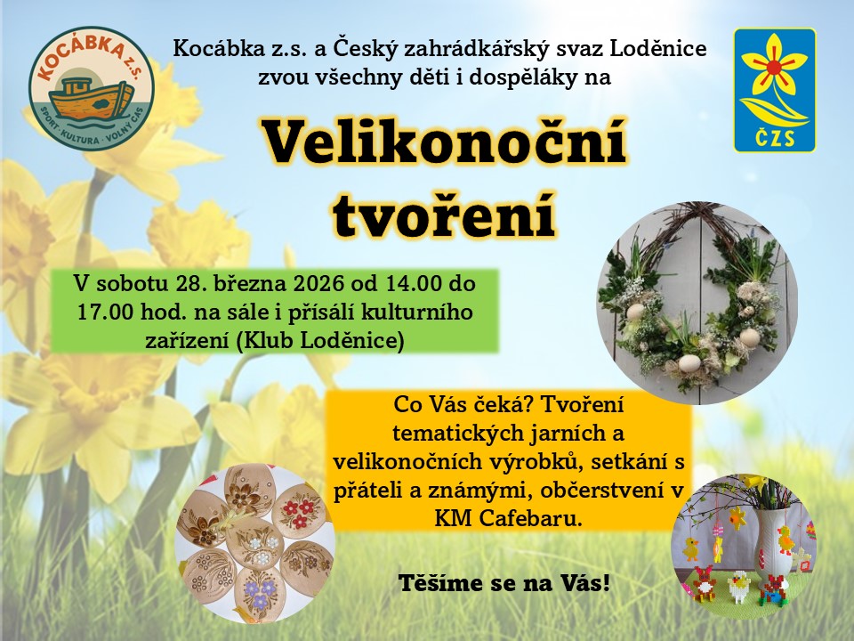 Kocábka z.s. a Český zahrádkářský svaz Loděnice zvou všechny děti i dospěláky v sobotu 28. března 2026 od 14:00 do 17:00 do Kulturního zařízení na VELIKONOČNÍ TVOŘENÍ.